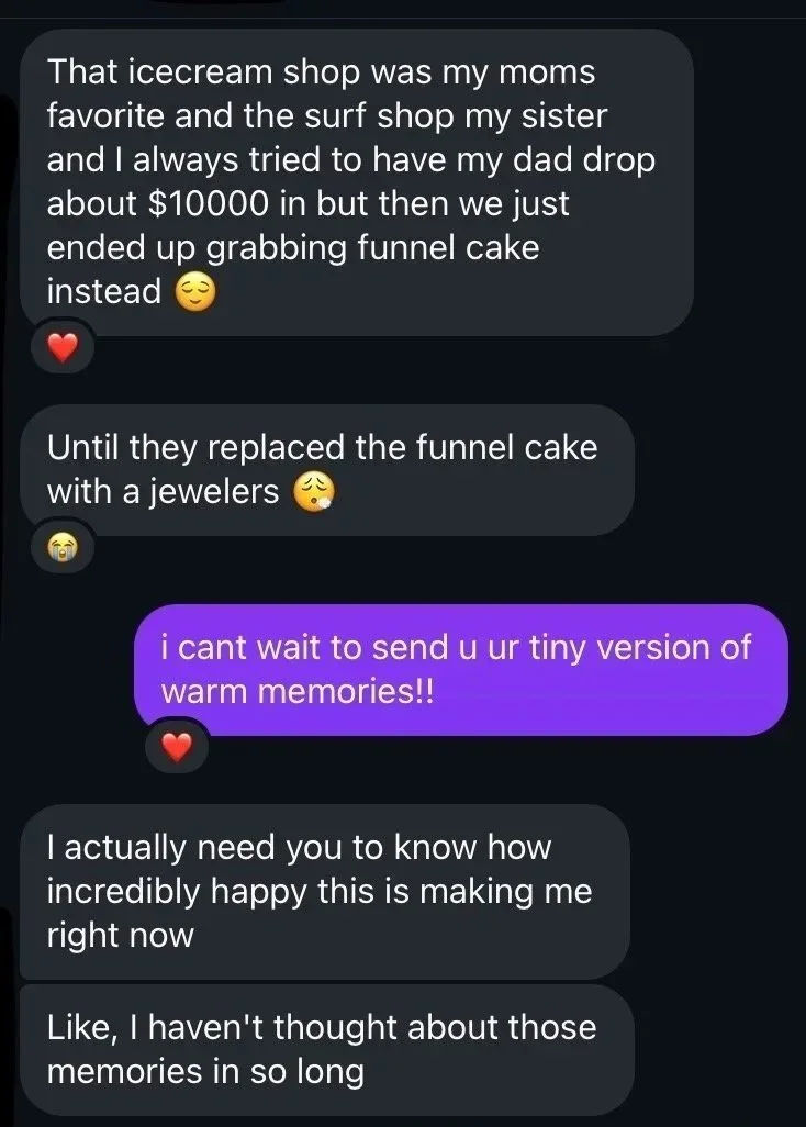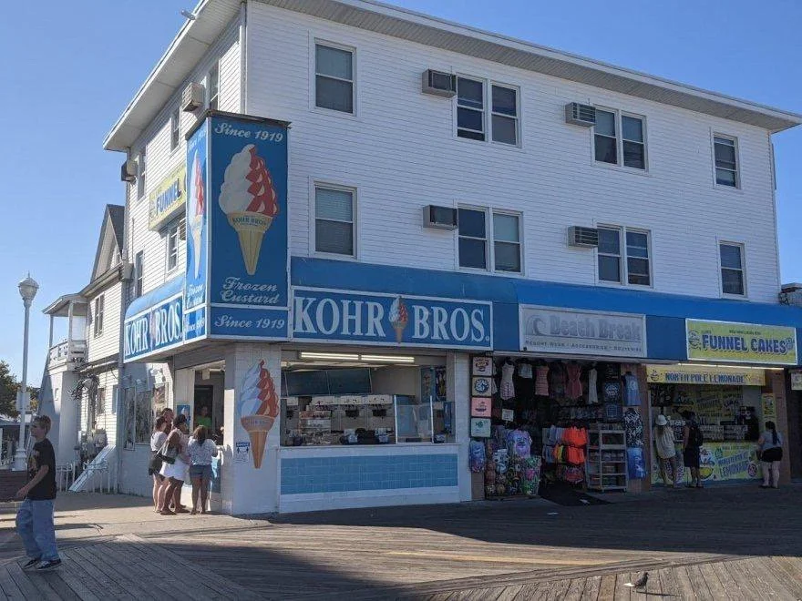 M’s fondest childhood memories were at this stretch of the famous boardwalk in Ocean City, Maryland. It held three specific shops, each with a special meaning to her and her family: her late Mom’s favorite frozen custard, the souvenirs and trinkets that M and her sister used to always get lost in, and the funnel cakes to end their adventures on.
